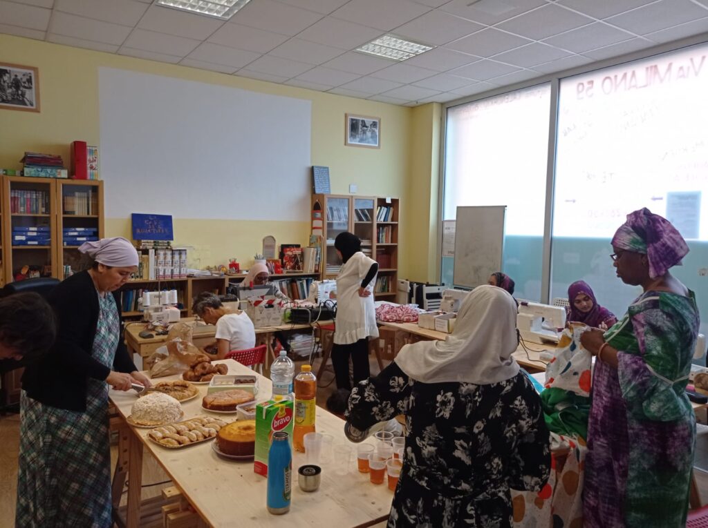 Al corso di italiano per donne è legata l’attività della sartoria che si svolge al piano terra tre mattine a settimana. Anche questo è un ambiente esclusivamente femminile, ma più rilassato e conviviale, in cui si incontrano donne di tutte le età, alcune anche italiane. «Fanno cose che farebbero normalmente anche a casa», spiega Elisa, «perché non hanno molti soldi da spendere, quindi fanno i vestiti per le loro famiglie o che possono rivendere ai mercatini, oppure piccole riparazioni. Ci sono un paio di signori del quartiere che hanno chiesto di tutto, dall’orlo ai pantaloni alle tende, lasciando un’offerta per l’acquisto delle stoffe e di altri materiali. A volte lavorano su commissione, per esempio la cooperativa Anemone aveva ordinato dei grembiuli. È bello vedere che si è creato un gruppo affiatato, addirittura la mattina portano i dolci per fare la merenda tutte insieme. Ricordo una signora anziana afgana che non parlava una parola di italiano, forse sapeva solo fare la sua firma, però veniva volentieri per passare il tempo in compagnia. Ci sono poi due o tre personaggi un po’ matti che passano di qua per fare due chiacchiere con le sarte e anche loro portano un po’ di allegria».